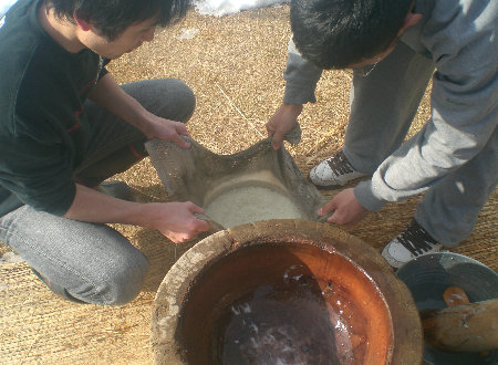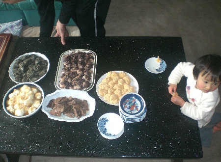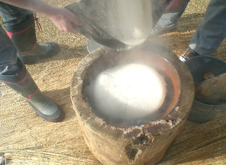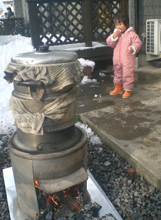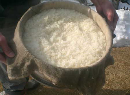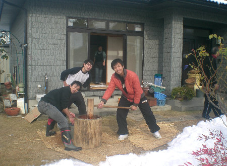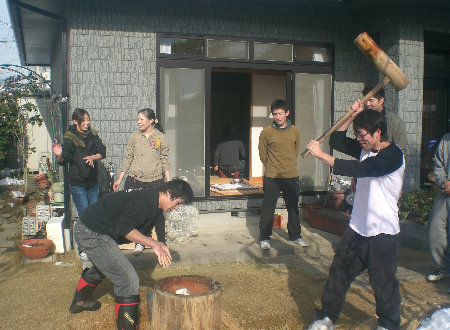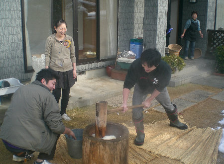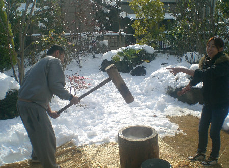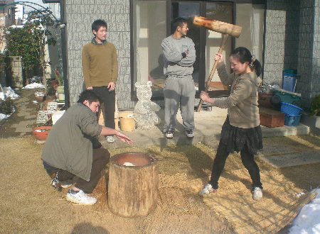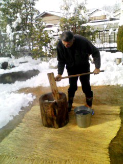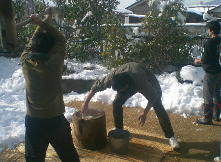 「筋肉餅つき大会2009」 No.6邸にて開催 ![]() 電気は一切使わない。 薪でふかした餅米を、杵と臼でつく ![]() 普段の筋トレの成果を見せるとき ![]() 用意された餅米、 なんと 23kg ![]() ![]() これを全て餅にする ![]() 頼れるのは己の筋肉のみ。。。 筋肉餅つき大会会場(No.6邸の庭) こういうので餅米をふかす ![]() 後ろで雪 にかぶりついとるのはNo.6の娘 (自称ちゅっちゅ)左 : ふかしたてホカホカ ちょっとつまんで硬さを見る。中右 : OKなら臼へ移す ![]() このままつくと米が飛び散るのでまずは潰す。 そこそこ潰れたところでいよいよつく ![]() まずは餅つきのベテランNo.6パパにお手本を見せてもらう ![]() 簡単そうにやるけど、これがなかなか難しい ![]() パワーだけじゃなくテクニックも必要。 餅をこねる係の”合いの手”とのタイミングを合わせる。 臼を叩いてしまいそうで怖いので弱めから始めて徐々に力を込めていく。。。 10分くらいつき続け1臼目完成 ![]() これを薄く広げる。 「ちゅっちゅもやるぅ~!」ってNo.6の娘も参戦。 徐々にみんな慣れてきて、力強くペッタンできるようになってきた ![]() 昔は毎年やっとったらしく経験値の差を見せるNo.6。 筋トレの一環として参加のNo.12 (プロテイン持参 )。196cmの長身を活かし杵を持ち上げて落とすだけの省エネ餅つきNo.7 (画像無し・・・)。 参加メンバーの中で最低身長というハンデを背負いながらも何とか頑張るNo.4。 前日に新婚旅行から帰って来た僧侶No.5。 一番うまかった ![]() 毎日我が子を抱っこして発達させた筋肉で餅をつく敏腕マネ。 長い手足を活かして餅をつくNo.14。 どんどん出来上がっていく ![]() 交代交代でつきまくり、約4時間かけて合計8臼分をつきあげた ![]() その頃にはみんな握力がなくなり腕がプルプルやった ![]() 並べられた餅を目の前にして早く食べたそうなちゅっちゅ ![]() 正真正銘 「手作り餅」 を戴く。 きな粉 あんこ 黒胡麻 くるみ 大根おろし&醤油 腕がプルプルしてなかなか箸で餅をつかめない・・・。 うみゃ~ ![]() 腹一杯食った上お土産も頂きました ![]() いやぁ~いい休日やった ![]() No.6家の皆さんありがとうございました m( _ _ )m 鏡餅付 ![]() 後ろのテレビはM-1での笑い飯 ![]() 予選の「鳥人」は爆笑ネタやったんに、決勝で「チンポジ」って・・・ 餅つき大会中に南信在住のNo.9からメール ![]() 「第一子誕生しました 」ANTELOPES 4人目のパパになりました。 おめでとぉ~ ![]() PR この記事にコメントする