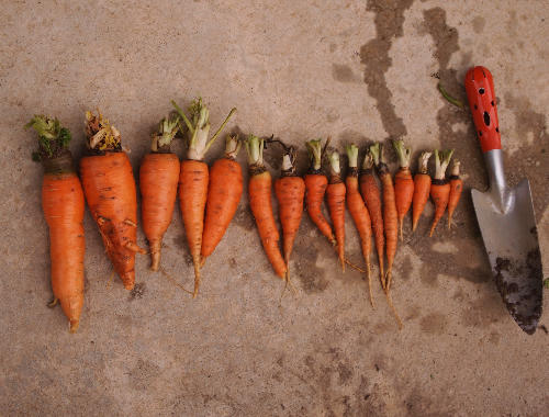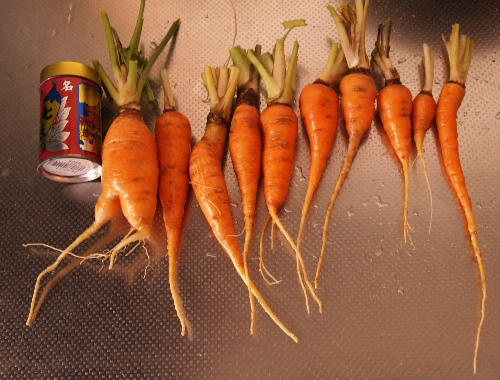根菜はどれだけ育っとるかが分からんから盛り上がりに欠ける ![]() 掘り起こしてみると・・・ オレンジ色の物体が姿を現す ![]() ちゃんと人参になっとる ![]() けどちっちぇえ。。 小さい芽の段階で間引きして、 スペースを与えたトコはそこそこ育っとる ![]() 間引きしんと密集しとるとこは細いのしか育っとらん ![]() 心を鬼にしんと十分な間引きはできん・・・ デカイのはまぁまぁ食うトコありそう ![]() 小さいのは・・・皮むいたら既に野菜スティックやな。。。 ふと見ると末っ子2本が三角コーナーに・・・。 ・・・しゃあねぇか ![]() もっと鬼にならんといかんかったな。。。 1週間後に第二次収穫 ![]() なかなか立派なのも採れた ![]() しかしちっちぇのはまたしても三角コーナーへ。 すまん ![]() これで人参も終了 ![]() 2012年度の総収穫量 ![]() ミニトマト(苗2本) 509個 ピーマン(苗3本) 151個 オクラ(種1袋) 550個 ![]() 人参(種1袋、三角コーナー行き含む) 27本 上々のデキやな ![]() 特にオクラがすごかった。。。 今年の収穫を終えた我が畑 ![]() 地力回復に休ませるかと思いきや、寒さに強く冬を越せる野菜を植えた ![]() ホウレン草 と ニンニク ![]() ホウレン草は去年もやってなかなか採れた ![]() http://antelopes14.blog.shinobi.jp/Entry/214/ニンニクは初挑戦 ![]() 植える時期がちょっとおそかったからニンニクは失敗かも・・・。 どっちも特に世話しんくていい品種 ![]() 収穫は来春 ![]() 家庭菜園、冬の部の始まり。 PR この記事にコメントする